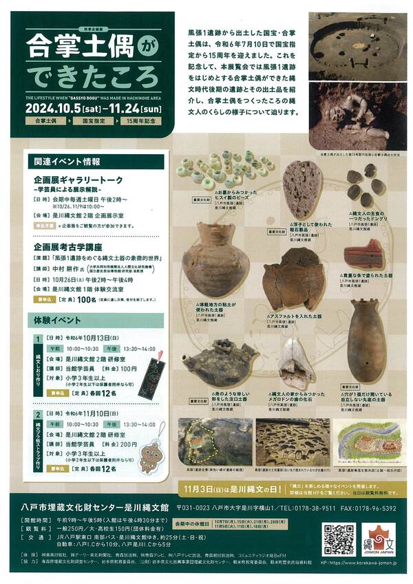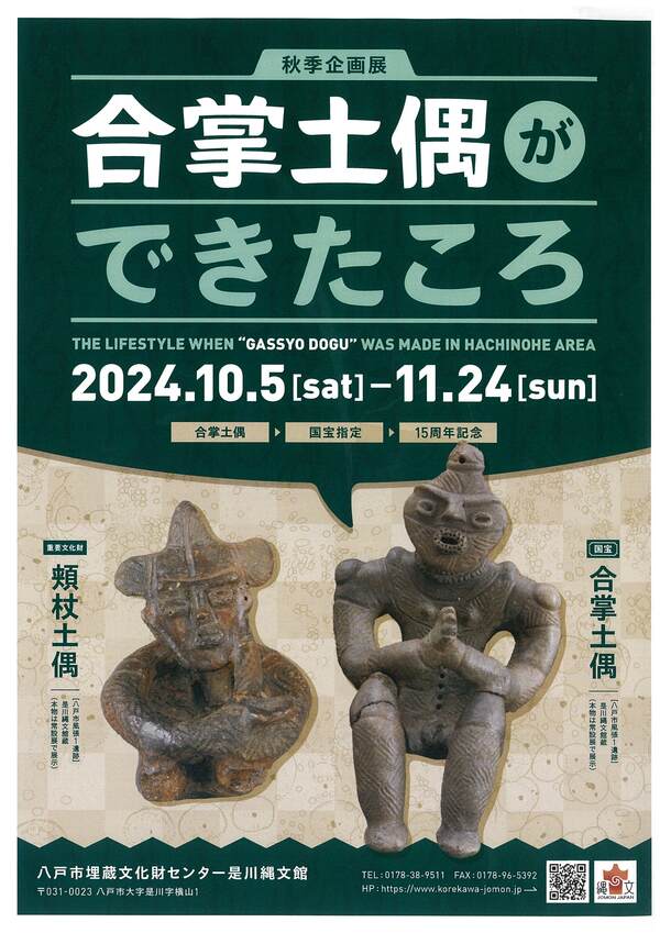 10月5日(土)~11月24日(日)の期間、「是川縄文館」では、「国宝 合掌土偶」が国宝指定されてから、今年の7月10日に15周年を迎えたことを記念して、「秋季企画展 合掌土偶ができたころ」を開催しています。
