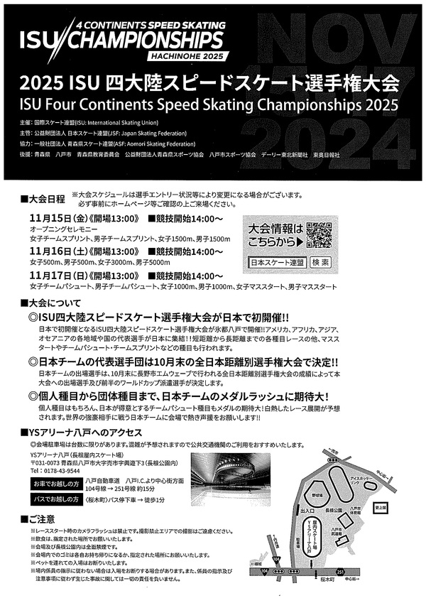 11/15(金)~17(日)に、YSアリーナ八戸で「2025 ISU 四大陸スピードスケート選手権大会」が開催されます。
