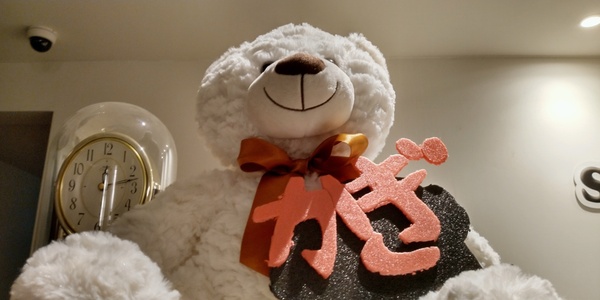 写真の熊のぬいぐるみが目印でございます。ちなみにこちらの熊の名前は熊田熊次郎金五郎在衛門太郎寿二亜(クマダクマジロウキンゴロウザエモンタロウジュニア:私が命名しました)でございます。