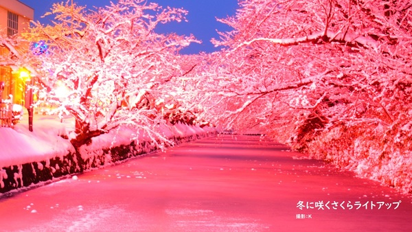 雪が積もった桜の枝にピンク色の照明を当てることで、あたかも桜が咲いているように見え、人々を魅了します。