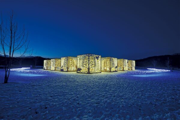 アイヌ文化にゆかりのある27種の動物のモニュメントを照らすイルミネーションが楽しめる。