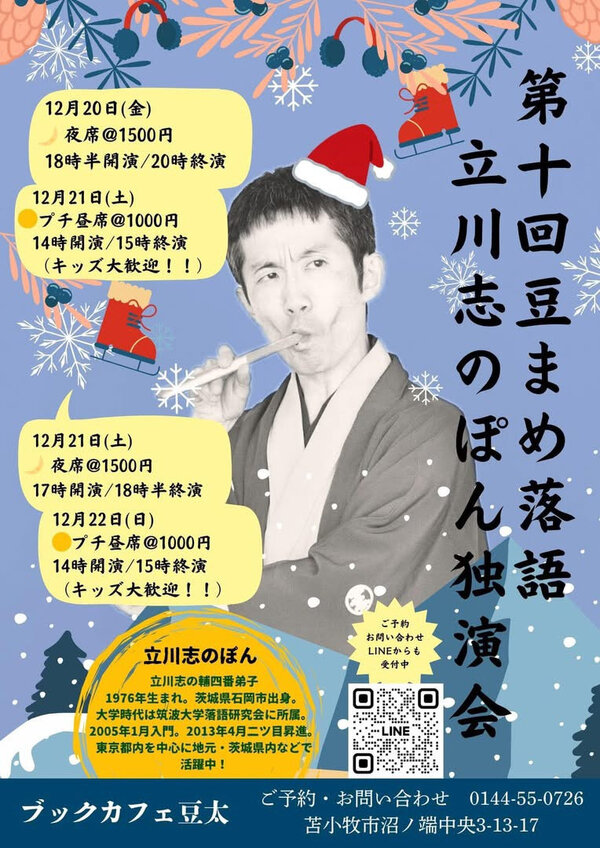 志のぽんさんは立川志の輔さんの弟子。ブックカフェ豆太で年3回程度、独演会を開いている。