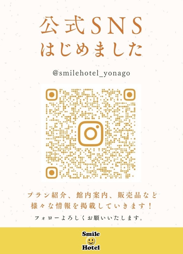フォローは画像のQRコードを読み取っていただくか、「スマイルホテル米子」で検索していただくよう