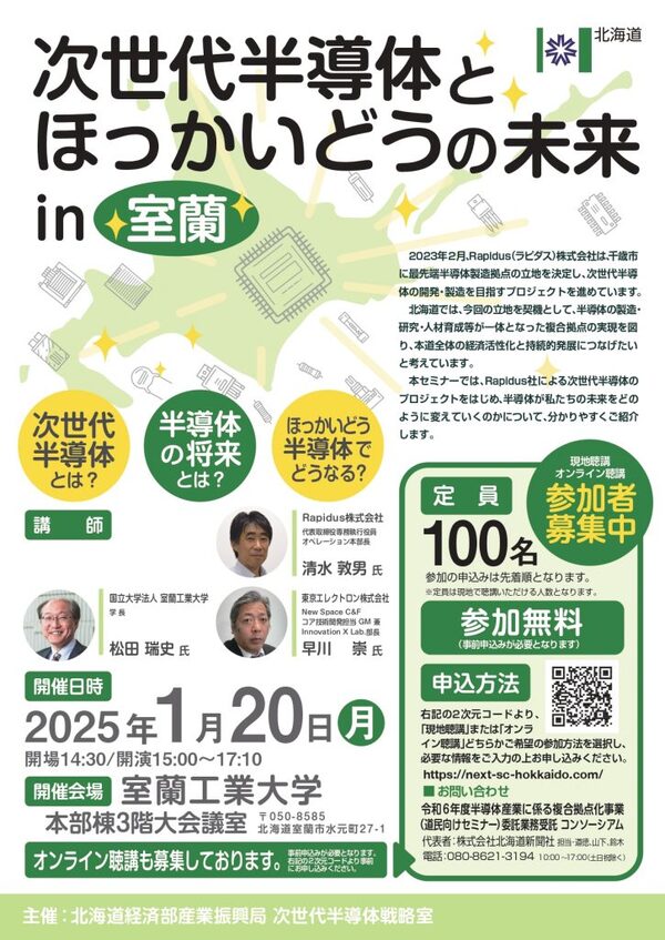 講師はラピダスの清水敦男・代表取締役専務執行役員、松田学長、東京エレクトロンの早川崇氏の3人。ラピダスのプロジェクトが北海道をどう変え、道民の暮らしにどう結びつくかなどを解説する。電子工学が専門の松田学長は、「半導体と私たちの暮らし」をテーマに講演し、生活と密接な関わりを持つ半導体について分かりやすく話す予定。