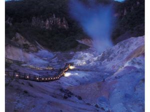 揺らめく灯りに照らされた「鬼火の路」が、皆様を地獄谷へと誘います。立ち上る白煙と山肌をかすかに照らす路の先には、幻想的な地獄谷の爆裂火口跡。暗闇だけにみせる荒々しい姿は、まさに現世とは思えないほど大自然の驚異を剥きだします。