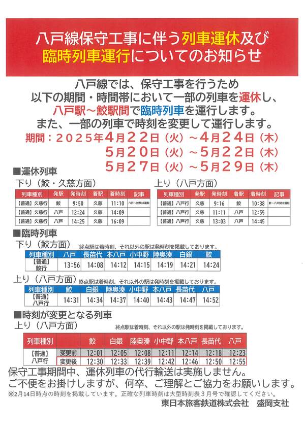 4/22(火)~24(木)の期間「JR八戸線」では「保守工事」が行われます。