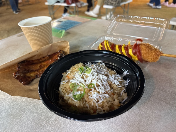 骨付き肉のスペアリブにしらすチャーハン、のびーるチーズハットグと満喫☆