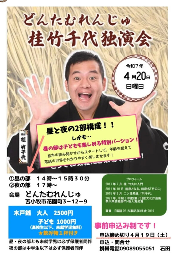 落語家の桂竹千代さんが古典や創作落語を披露する予定。昼席は前座に落語好きな苫小牧市民による絵本の読み聞かせも行う。昼席は小学生未満、夜席は中学生以下はそれぞれ保護者同伴。