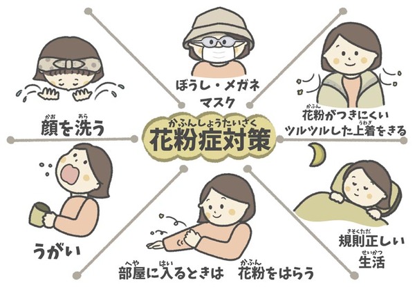 花粉の症状を完全に無くすことは難しいですが、外出する際に「マスクをつける」「眼鏡を着用する」「つばの広い帽子をかぶる」「ツルツルした素材の上着を着る」