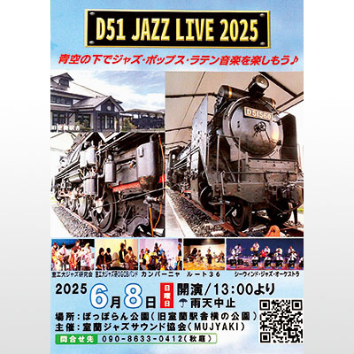 旧室蘭駅舎横のD51形蒸気機関車(SL)前でジャズ演奏を披露する野外ジャズイベント。