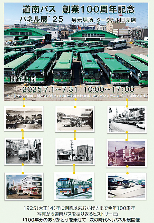 道南バス(室蘭)は7月3日、創立100周年を迎えた。これを記念し、パネル展を開催する。創立当初の様子や昔の車両、街並みなどを映した写真が並び、バス待ちの乗客らが「地域の足」として親しまれてきた道南バスの歩みを振り返っている。