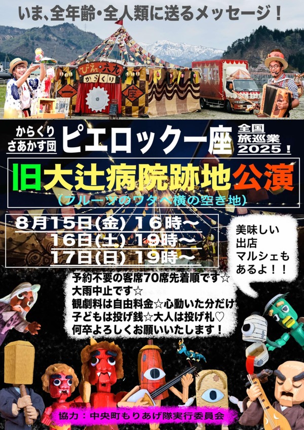 熊本を拠点に活動し、全国各地で巡業を行っているからくり人形のサーカス集団「ピエロック一座」による公演。一座の2人組が操る木製のからくり人形たちが、大道芸や楽器演奏を披露する。