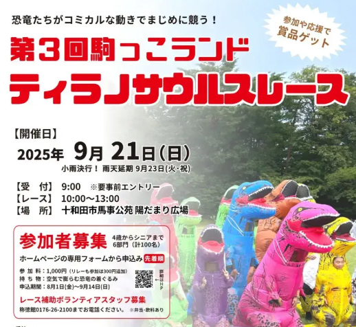 青森県十和田市馬事公苑 駒っこランド にて恐竜着ぐるみレースが開催されます!