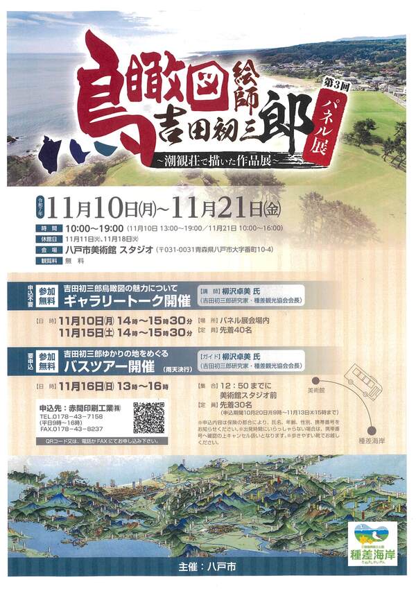 11月10日(月)~21日(金)に「八戸市美術館」の「スタジオ」で、「鳥瞰図絵師 吉田初三郎 第3回パネル展~潮観荘で描いた作品展~」が開催されます。