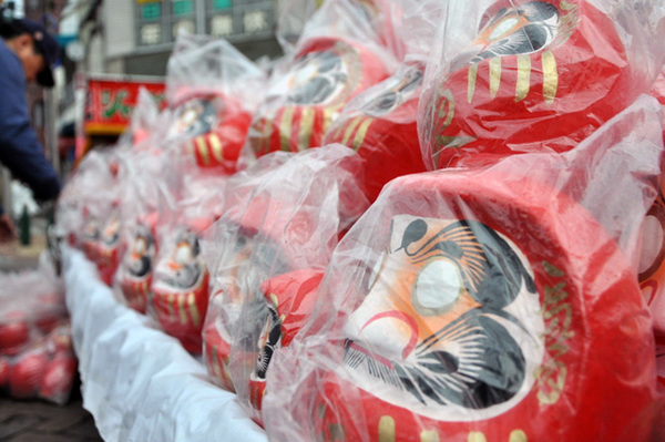毎年2月7日に熊谷星川の流れを背にして、だるま店が並びます。