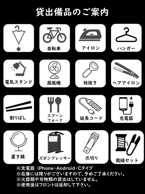 ※火器類や刃物類・LANケーブルの貸出は行っておりません。