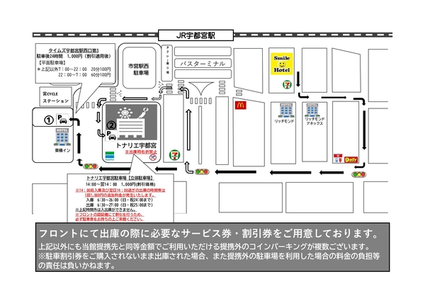 ※駐車割引券をご購入されないまま出庫された場合、また提携外の駐車場を利用した場合の料金の負担等の責任は負いかねます。