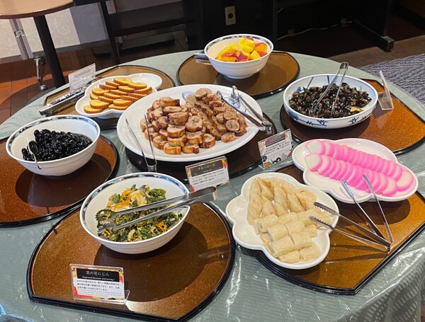さて当ホテルの朝食バイキングでは、毎年恒例のおせち料理をご提供させて頂きました。