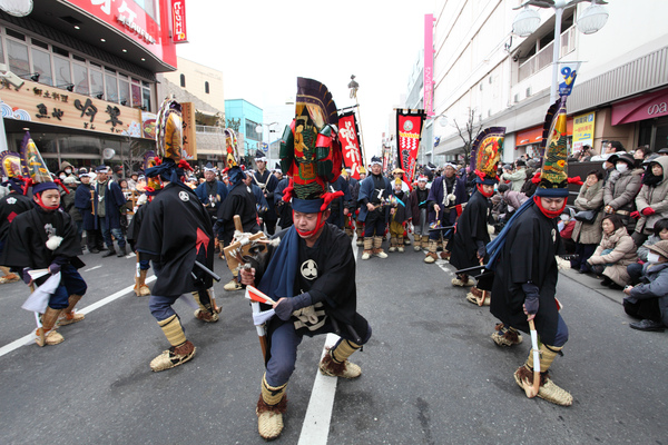 「八戸市庁本館前市民広場」「八戸市公会堂」「史跡根城の広場」などで、公演が行われますが、特に市内の中心部に、30数組のえんぶり組が集結して行われる「一斉摺り」は、最大の見どころです。
