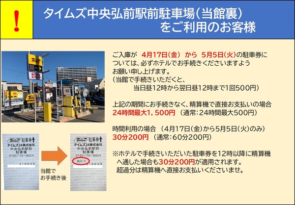 上記の期間でタイムズ中央弘前駅前駐車場へ入庫のお客様は必ず駐車券をホテルフロントまでお持ちくださるようお願いいたします。(当日昼12時から翌日昼12時まで、1泊500円)