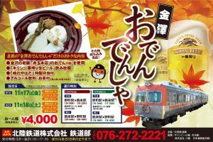 このおでんでんしゃとは、電車内で金沢の老舗「赤玉本店」のおでんや、「キリン一番搾り生ビール」などを頂ける美味しい(?)電車のようです。
