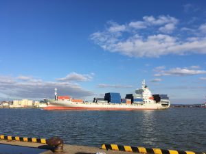 釣り人が糸を垂らしていたり、船員さんの作業を一通り眺めていると、韓国の貨物船が出港するのが見えました。ゆっくりと動く船に青い空、青い海、なんとも癒された一日でした。
