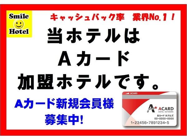 全国のスマイルホテル他、400ホテル以上でポイントがたまり、たまったポイントに応じて現金キャッシュバックなど特典満載の「Aカード」♪