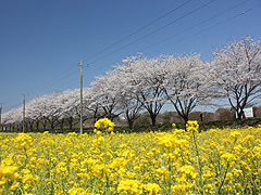 都幾川の八幡橋~二瀬橋~学校橋までの約2㌔の道に252本のソメイヨシノが咲きます。菜の花も一面に咲いている為とてもきれいな場所となってます