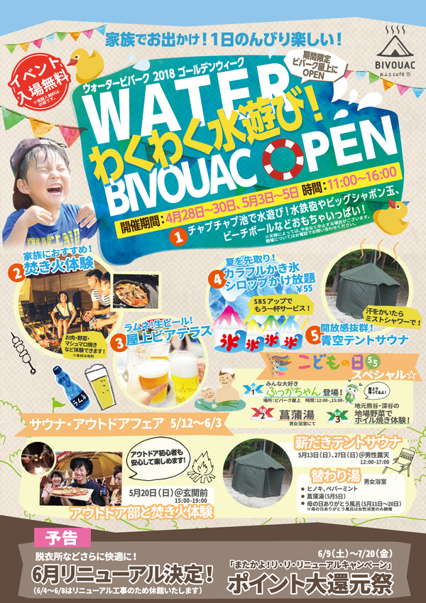 4月28~30日、5月3~5日におふろcafe BIVOUAC で、
