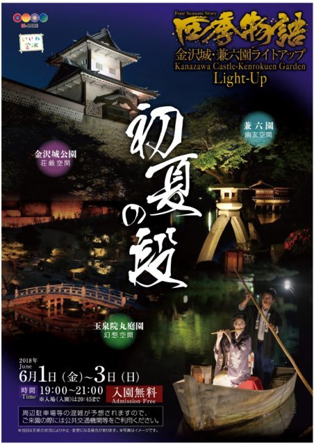 6月1日~3日までの3日間、金沢で行われる百万石まつりに合わせて金沢城公園、玉泉院丸庭園、兼六園の3か所が期間限定でライトアップする「金沢城・兼六園四季物語 初夏の段」が開催されます!!!この機会に是非、ライトアップ実施期間中は入園無料となっておりますので、普段は入れない夜の兼六園をお楽しみ下さいませ。