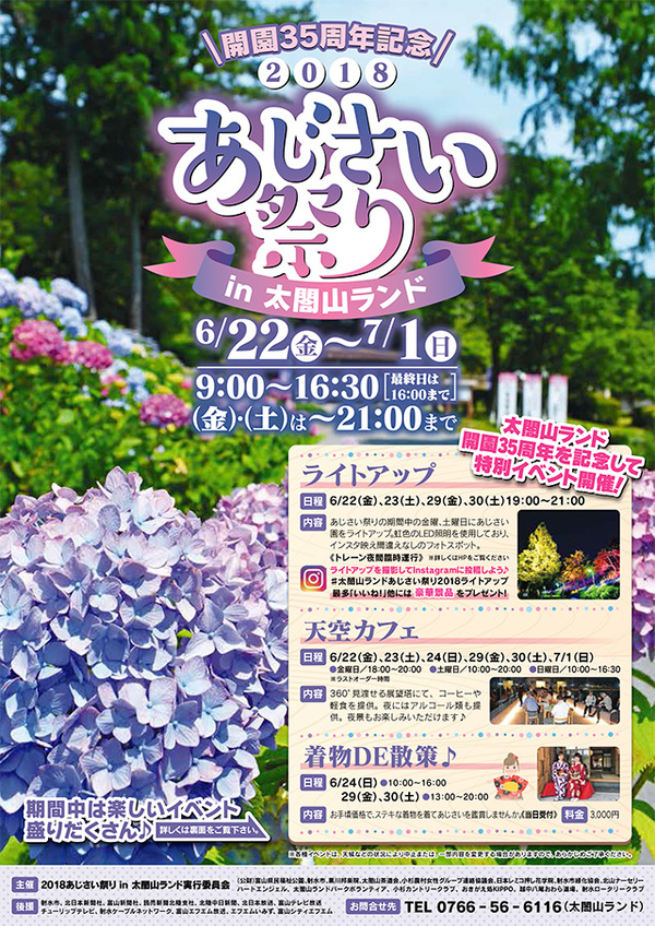 6月22日~7月1日まで富山県にある太閤山ランドにて、あじさい祭りが開催されます!!毎年園内では約70種・2万株ものあじさいが見頃になります。開催期間中は、他にも琴演奏会やお茶会、あじさいの挿し木体験等盛りだくさんの内容になっています!又今年は開園35周年記念として、特別イベントの「あじさいライトアップ」も予定しております。この機会に是非あじさいを見に足を運んでみてはいかがでしょうか?