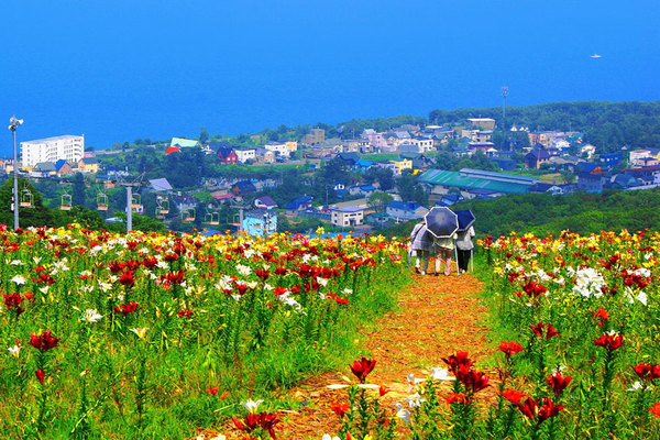 「北海道グルメまつり」の舞台は、北海道最大規模を誇る小樽のゆりの名所「オーンズ春香山ゆり園」。冬はスキー場として営業している「オーンズ」が、平成25年(2013)より夏季限定でゆり園をオープン!ゲレンデ斜面に咲き誇る50種213万輪ものゆりと、石狩湾を一望できる景観を楽しめるようになりました。