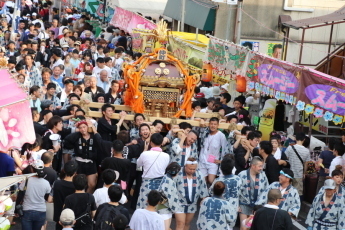 中山道が日本最長級約3キロメートルにわたり歩行者天国となり、その中を12基の勇壮なみこしが練り歩きます。