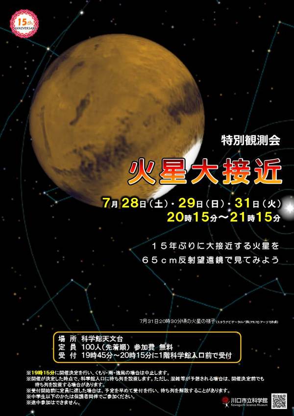 川口市立科学館では火星を65㎝反射望遠鏡で観察する特別観測会が開催されます。