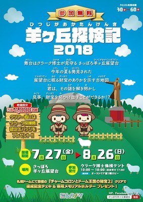中学生以下を対象の親子で楽しめる宝探しゲーム。クラーク博士が残した地図を頼りに、羊ヶ丘展望台を探検しながら、数々の問題を解読し「宝のキーワード」を手にいれるというもの。「宝のキーワード」まで辿り着くと、クラーク探検隊認定缶バッジを受け取ることができる(数量限定)。また、今年は、札幌ドームで開催されている宝探しゲーム「チャームコロンとドーム王国の秘宝2」とコラボし、両方の宝探しゲームクリアでさらにプレゼントがもらえる 。所要時間は30~60分。