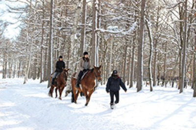 大自然の中で馬とのふれあいを楽しめるノーザンホースパーク。人気のハッピー ポニーショーのほか、馬そりやスノーラフティングなど、冬ならではの充実したアクティビティが楽しめる。きゅう舎ではポニーや引退した競走馬に会えるほか、レストランで味わう冬のメニューも要チェック