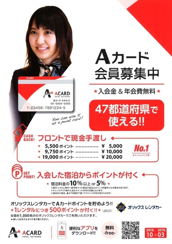 ぜひ、ご出張、ご旅行の際にはAカードをご持参下さい。入会金・年会費は無料となっています。