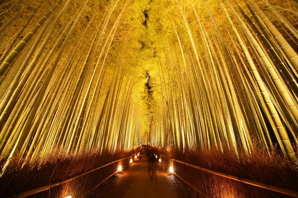 昼は緑が映える竹林ですが、この期間中は竹が紅葉したかのように黄金色に姿を変えます。