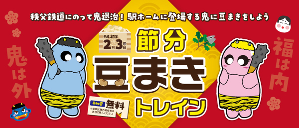 熊谷~寄居間・寄居~大野原間、各区間1駅ずつ駅ホームにて豆まきを行います。