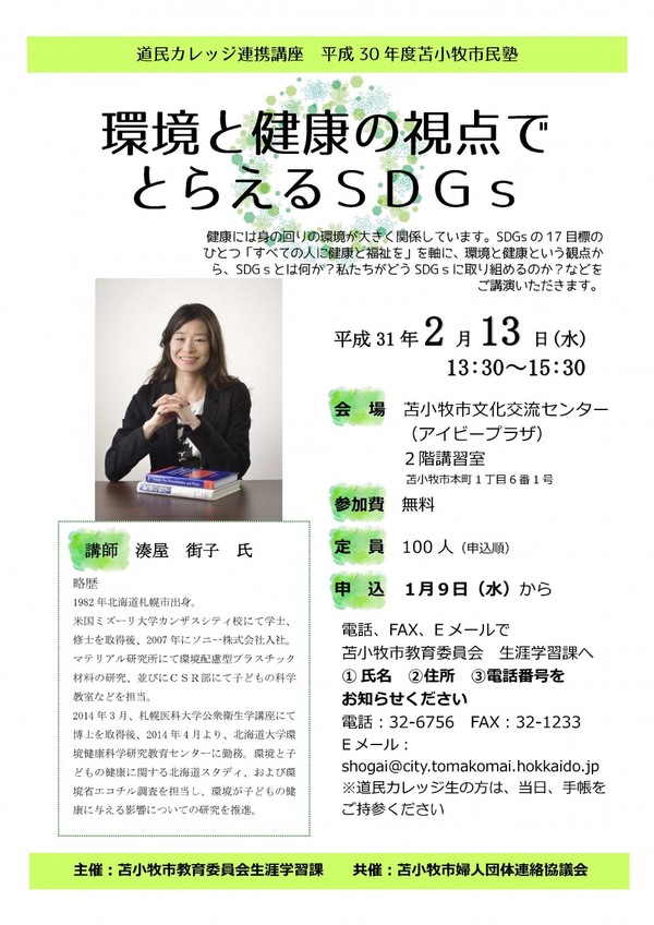 今年度は、北海道大学の湊屋街子先生に、環境と健康という観点から、SDGsとは何か?私たちがどうSDGsに取り組めるのか?などについて講演していただきます。
