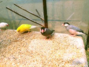 ガラス越しにセキセイインコ、文鳥、カナリア、オカメインコ…