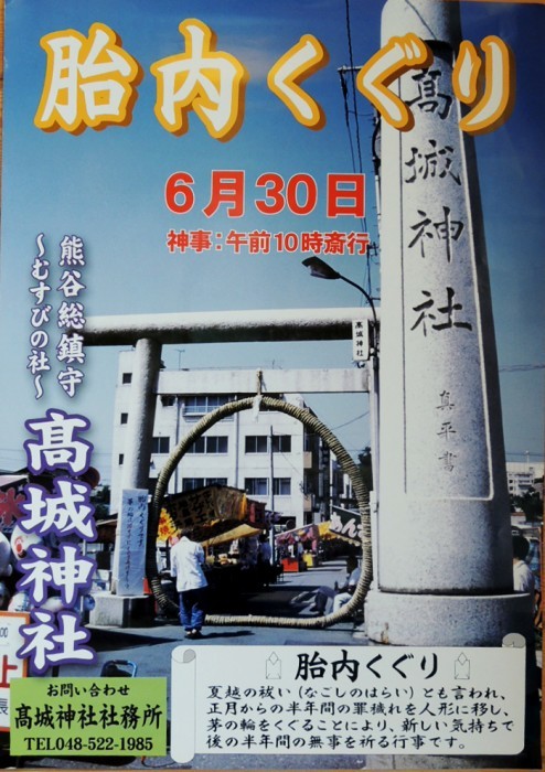 高城神社では、6月30日に参道の一の鳥居に4メートルほどもある大きな茅の輪が作られ、人々がこれをくぐって半年間の穢(けがれ)を清め、厄災から逃れるという行事です。