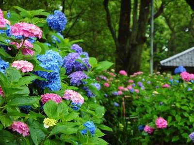 眼病平癒の祈願所として親しまれているこのお寺ですが、ここではこの時期になんと27種5000株の紫陽花を見ることが出来ます。特に本堂から奥へと向かう300mの参道は「あじさいのみち」と呼ばれ多種多様なあじさいが咲き競う中を散策できるようになっています。またそれだけではなく近年では、手水鉢に紫陽花が浮かぶが綺麗だと話題を集めています。