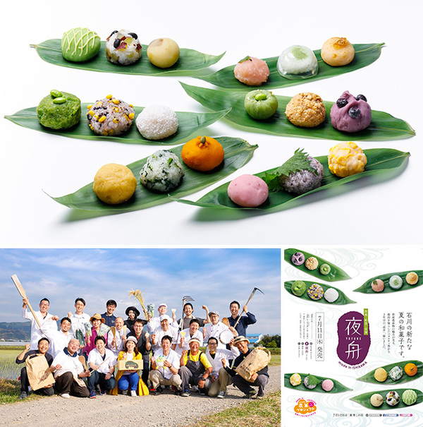 「夜舟」とは、「ぼたもち」や「おはぎ」の夏の呼び方で、7月をお盆とする金沢と県内一部地域では、この時期のお墓参りに欠かせないお菓子。石川県内の農家と和菓子職人が、2年目開催となる県産農産物で新しいお菓子を創造する農菓プロジェクトでは計19種類の夜舟が参加和菓子店ならびに集合販売会で販売されます。この機会にぜひ石川の新しい夏のお菓子を召し上がってみてはいかがでしょうか?