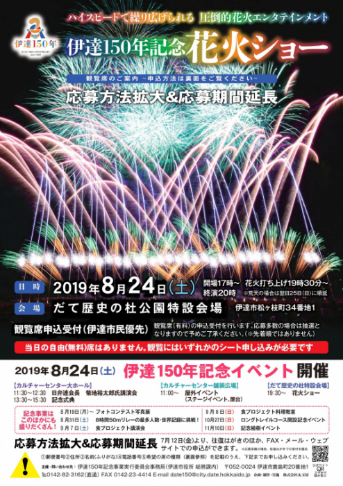 伊達150年”を記念して「伊達150年記念花火ショー」が、総合公園だて歴史の杜特設会場で開催されます。ハイスピードで繰り広げられる音楽と照明、レーザーをミックスした「花火ファンタジア」と呼ばれる演出で、約4000発の花火が打ち上げられます。