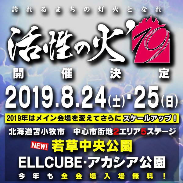 今年も北海道最大級の野外音楽フェス『活性の火’19』が8月24~25日、苫小牧駅前各所にて