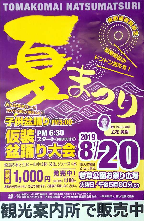 子ども盆踊りや仮装盆踊り、出店や抽選会などが行われ、苫小牧観光案内所などでお得な前売券を販売しています。