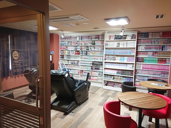 1階リフレッシュルーム内ですので、コミック3000冊以上、マッサージチェア、パソコンコーナー、と充実しております!