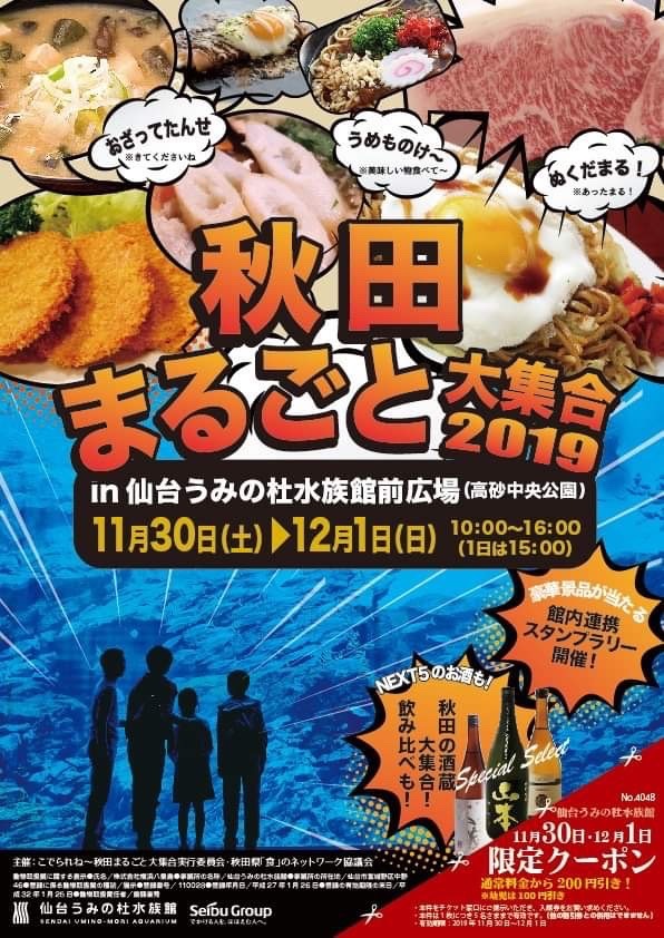 2019年11月30日(土)、12月1日(日)の2日間、秋田県観光イベント「秋田まるごと大集合2019 in仙台うみの杜水族館」を開催いたします。