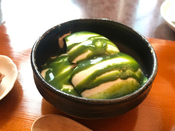 そして、デザートにはお豆腐に濃い目の抹茶ソースをかけて食べる「抹茶とうふスイーツ」!